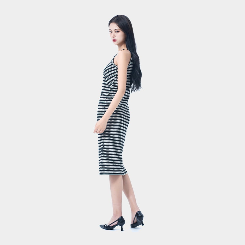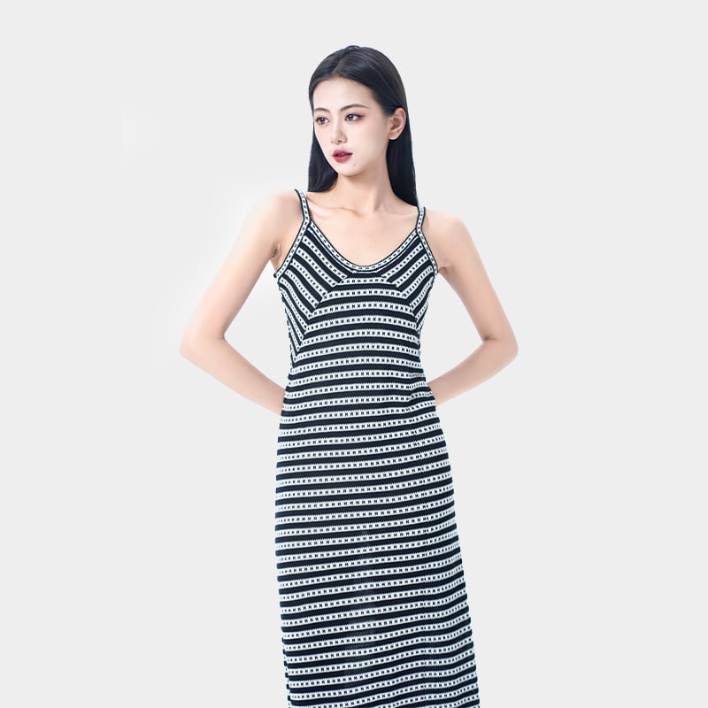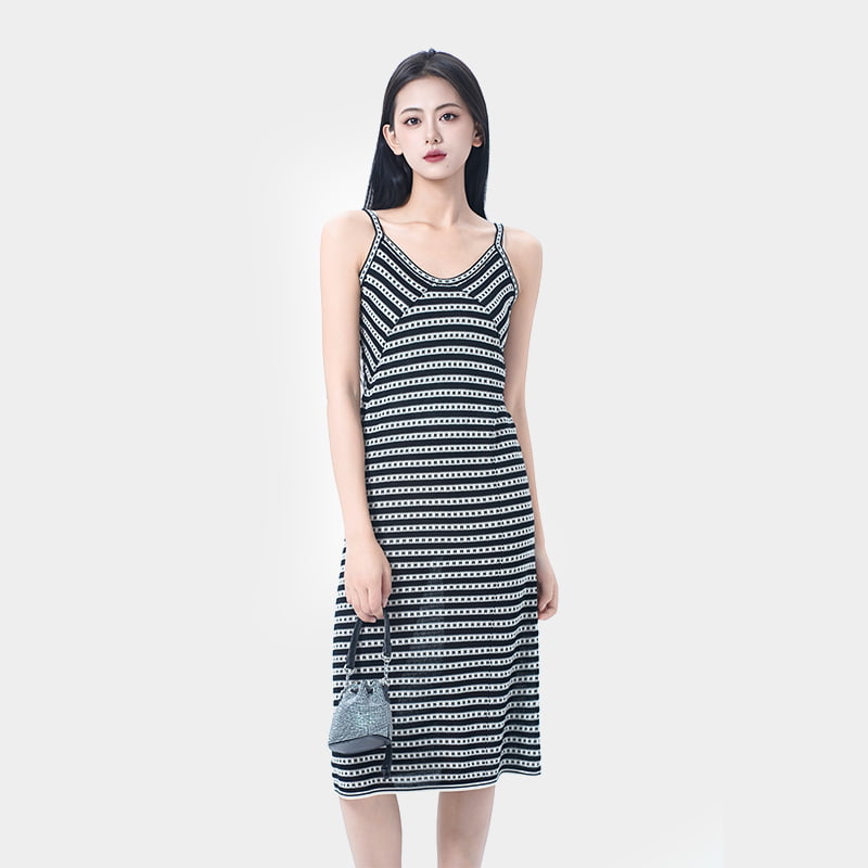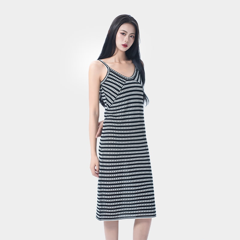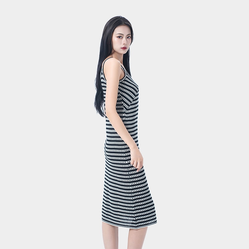 The classic black-and-white stripes create a slimming effect while elongating body proportions. The camisole design highlights the collarbone and shoulders, giving a graceful silhouette that flatters different body types. Made from summer-exclusive lyocell yarn, it offers a cool, silky touch that is breathable and comfortable. Versatile in style, this dress allows multiple summer looks with ease.